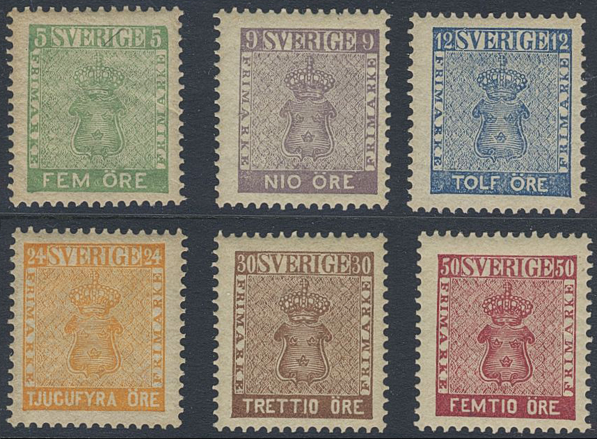 Sweden. Facit 7–12N1 ★, SET reprints perf 13 1885. Nice set. SEK 5500