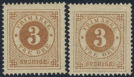 Sweden. Facit 17 ★, 3 öre brown. Two fresh examples in different shades. (2). SEK 2200