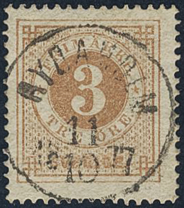 Sweden. Facit 17f used, 3 öre yellowish orange-brown. EXCELLENT cancellation RYDAHOLM 11.10.1877.