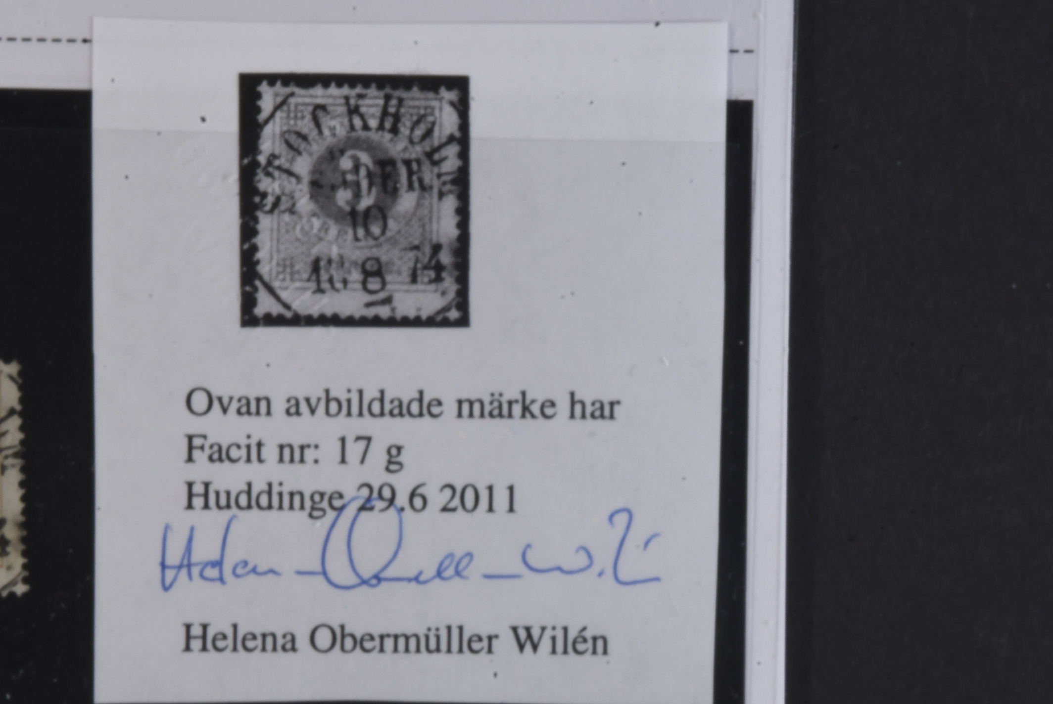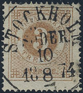 Sweden. Facit 17g used, 3 öre dull orange-brown. EXCELLENT cancellation STOCKHOLM SÖDER 10.8.1874. Opinion (shade) by HOW (2011).
