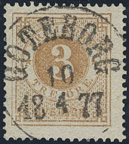 Sweden. Facit 17h used, 3 öre olivish orange-brown. EXCELLENT cancellation GÖTEBORG 10.4.1877. Slightly short perf. Signed by O.P.