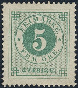 Sweden. Facit 19b (★), 5 öre light bluish green on white paper. Superb–EXCELLENT centering. Signed by O.P. SEK 3200