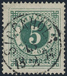 Sweden. Facit 19c used, 5 öre emerald green. Superb cancellation STOCKHOLM 13.2.1874. One somewhat short perf. Signed by O.P.