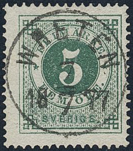 Sweden. Facit 19d used, 5 öre blue-green. EXCELLENT cancellation WRETEN 7.7.1877. One somewhat short perf.