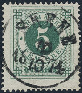 Sweden. Facit 19e used, 5 öre dark blue-green, smooth print. Superb cancellation SKENE 10.10.1874.