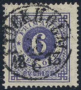 Sweden. Facit 20b used, 6 öre ultramarine-violet on yellowish paper. Superb cancellation STOCKHOLM 25.6.1873. Signed by O.P.