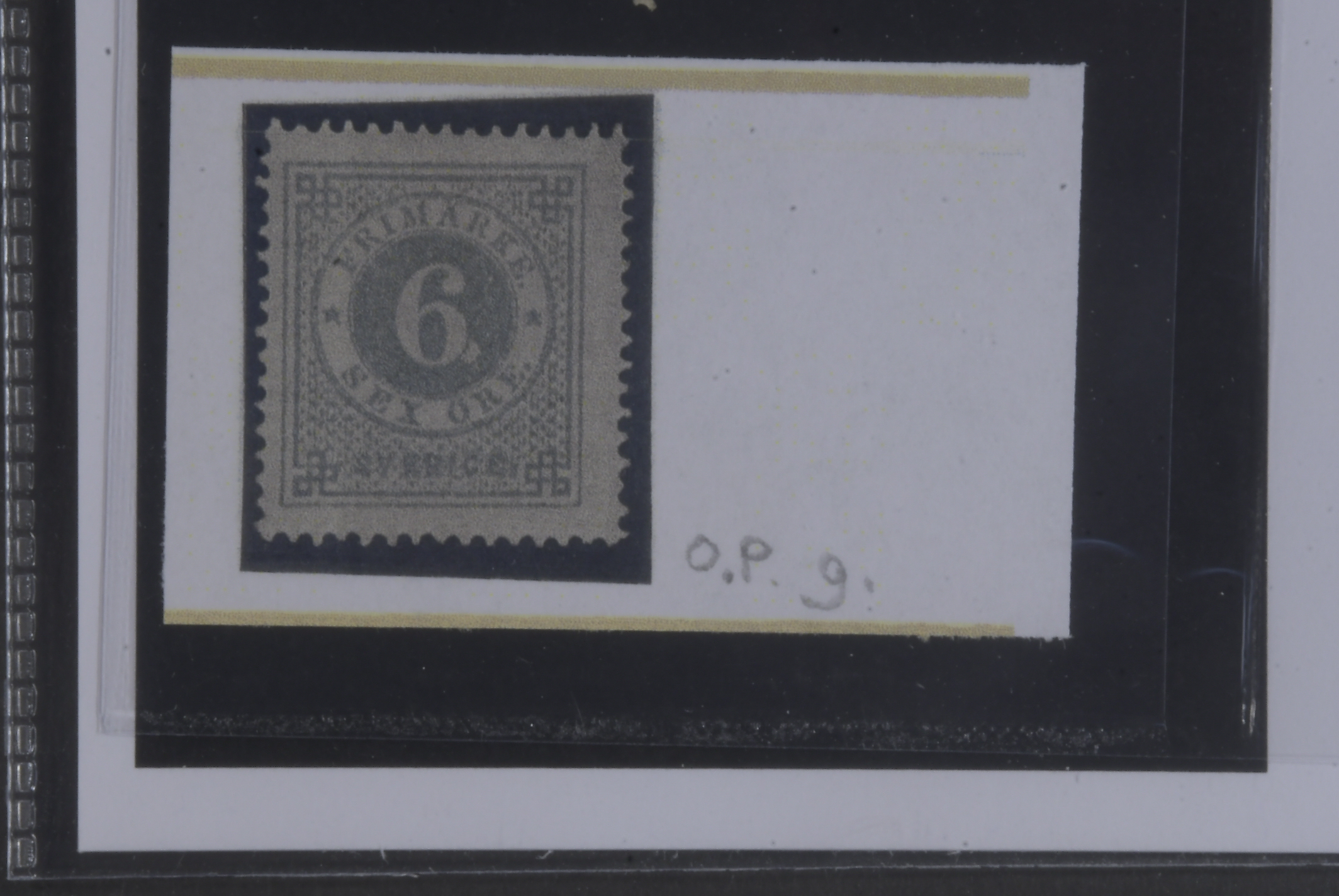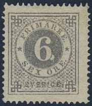 Sweden. Facit 20g ★, 6 öre olive-grey. Weakly bent corner perfs. Scarce shade. Opinion (shade) by O.P. SEK 10000