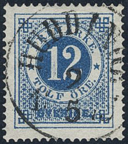 Sweden. Facit 21 used, 12 öre blue. EXCELLENT cancellation HUDDINGE 2.5.1873.