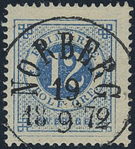 Sweden. Facit 21d used, 12 öre ultramarine-blue on yellowish paper. EXCELLENT cancellation NORBERG 19.9.1872. Opnion (shade) by O.P.
