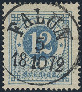 Sweden. Facit 21f used, 12 öre greenish blue on yellowish paper. EXCELLENT cancellation FALUN 5.10.1872. One somewhat short perf. Signed by O.P.