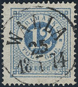 Sweden. Facit 21k used, 12 öre blue-light blue. EXCELLENT cancellation WALLA 25.1.1874. Signed by O.P.