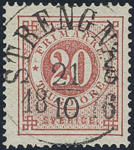 Sweden. Facit 22g used, 20 öre dull red. EXCELLENT cancellation STRENGNÄS 21.10.1876.