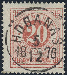Sweden. Facit 22h used, 20 öre brick red. EXCELLENT cancellation HÖGANÄS 5.12.1876.