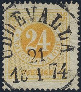 Sweden. Facit 24f used, 24 öre orange-yellow on ordinary paper. EXCELLENT cancellation UDDEVALLA 21.1.1874.