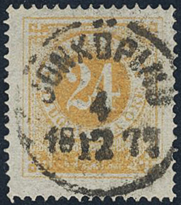 Sweden. Facit 24g used, 24 öre dull orange-dull yellowish orange. EXCELLENT cancellation JÖNKÖPING 4.12.1877. Signed by O.P.