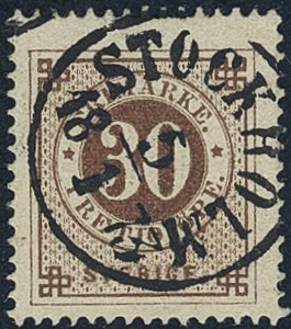 Sweden. Facit 25a1 used, 30 öre dark reddish brown on translucent paper. Beautiful example cancelled STOCKHOLM 5.1.1873. Very scarce shade. Signed by O.P. SEK 5000