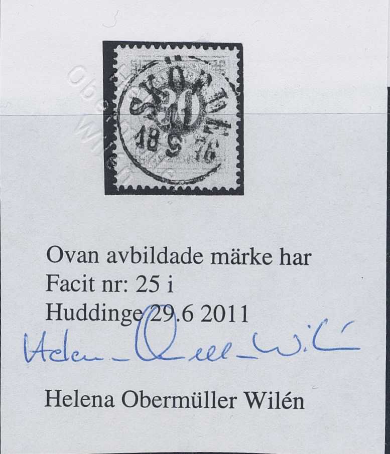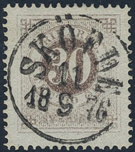 Sweden. Facit 25i used, 30 öre greyish brown, light framing. EXCELLENT cancellation SKÖFDE 11.9.1876. Opinion (shade) by HOW (2011).