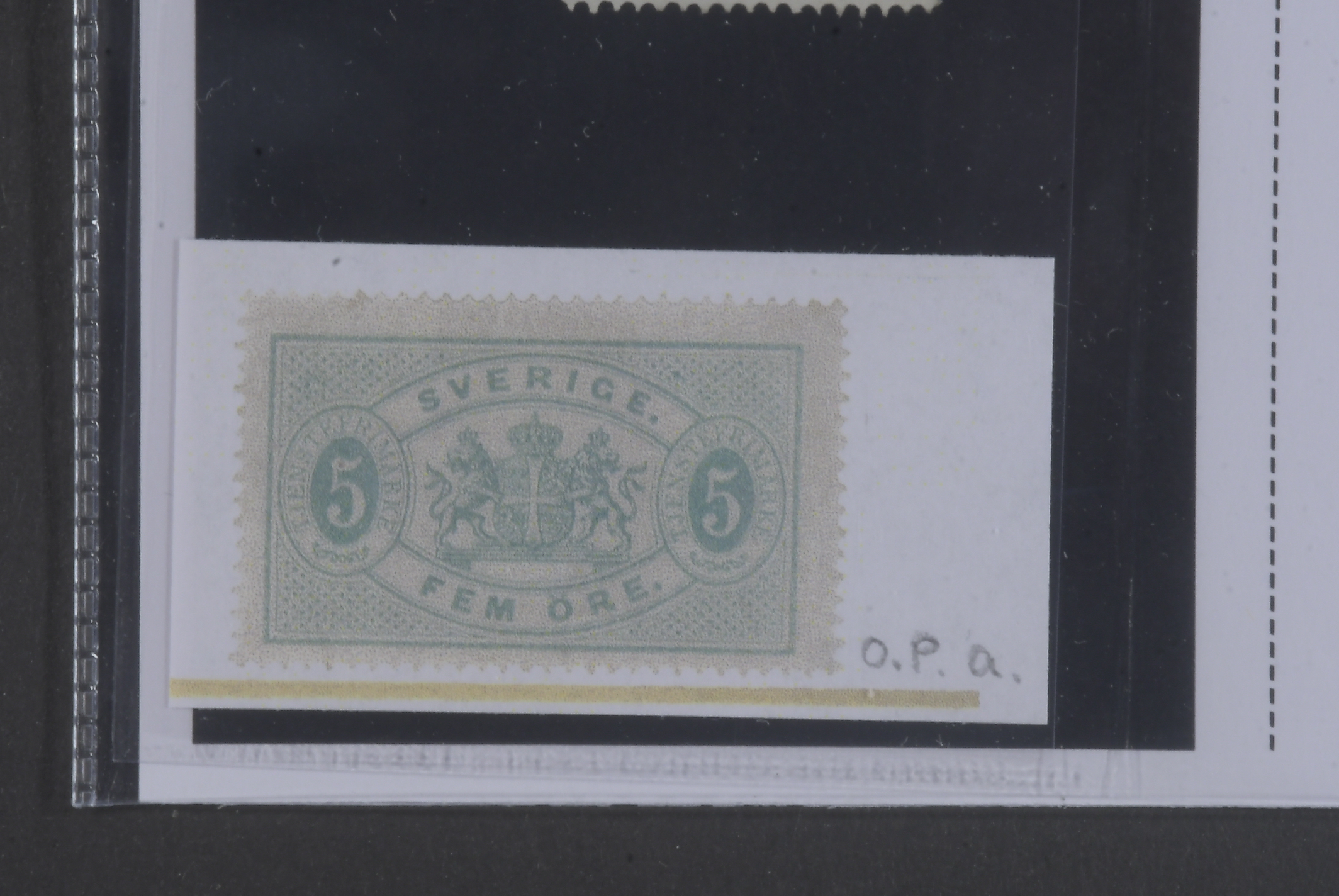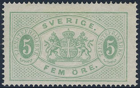 Sweden. Official Facit Tj3a ★, 5 öre bluish green, perf 14. Weakly bent corner. Owner mark on reverse. Opinion (shade) by O.P. SEK 1500