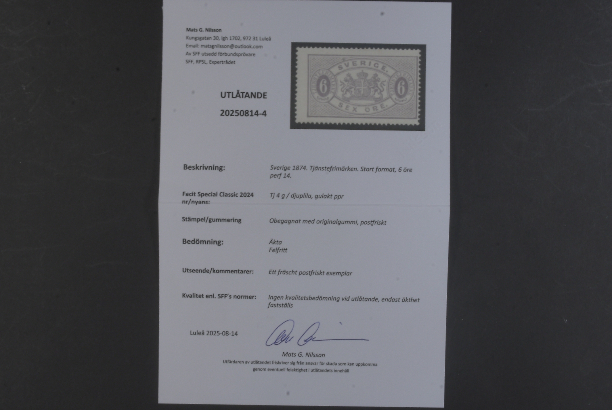 Sweden. Official Facit Tj4g ★★, 6 öre deep lilac, perf 14, yellowish paper. Opinion by Mats Nilsson (2025). SEK 5500+