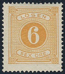 Sweden. Postage due Facit L4 ★★, 6 öre yellow, perf 14. Good centering. SEK 3500