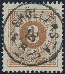 Sweden. Facit 28a used, 3 öre yellowish orange-brown. Superb cancellation SKÖLLERSTA 18.8.1877. SEK 50