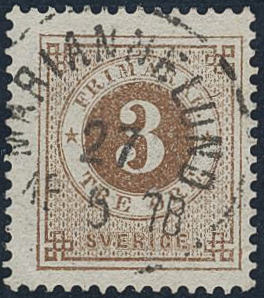 Sweden. Facit 28c used, 3 öre dark orange-brown. Superb cancellation MARIANNELUND 27.5.1878. Scarce shade.