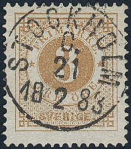 Sweden. Facit 28d used, 3 öre yellow-brown. EXCELLENT cancellation STOCKHOLM C 21.2.1883.