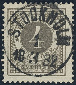 Sweden. Facit 29c1 used, 4 öre dark grey on white paper. EXCELLENT cancellation STOCKHOLM 1.3.1882.