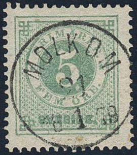 Sweden. Facit 30a used, 5 öre grey-green. EXCELLENT cancellation MOLKOM 21.1.1879. One slightly short perf.