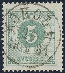 Sweden. Facit 30d used, 5 öre clear green. Superb cancellation MOHOLM 24.9.1881.