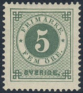 Sweden. Facit 30i ★, 5 öre bluish dark-green on calendered paper. Very fine and fresh.