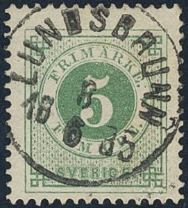 Sweden. Facit 30j used, 5 öre yellowish green. Superb cancellation LUNDSBRUNN 8.6.1885.