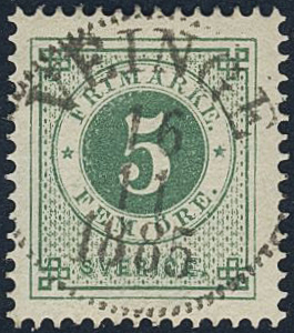 Sweden. Facit 30k used, 5 öre dark green. EXCELLENT cancellation VEINGE 16.11.1885.