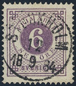 Sweden. Facit 31h used, 6 öre bluish lilac on soft paper. EXCELLENT 12.9.1884.