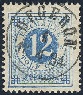 Sweden. Facit 32f used, 12 öre light clear blue. Superb–EXCELLENT cancellation DEGERÖN 6.9.1884.