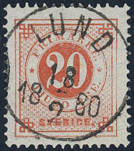 Sweden. Facit 33b used, 20 öre orange-red. EXCELLENT cancellation LUND 18.2.1880, plus tiny part of second pmk.