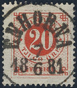 Sweden. Facit 33c used, 20 öre bright orange-red. EXCELLENT cancellation ENHÖRNA 7.6.1881. One somewhat short perf.