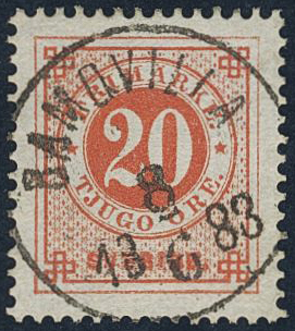 Sweden. Facit 33d used, 20 öre dull orange-red. Superb cancellation RAMQVILLA 8.6.1883.