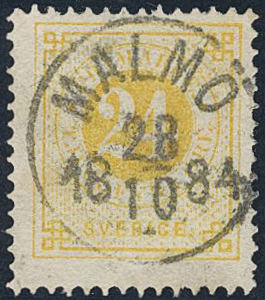Sweden. Facit 34k used, 24 öre yellow on calendered paper. EXCELLENT cancellation MALMÖM 28.10.1884.