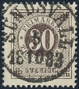 Sweden. Facit 35h used, 30 öre black-brown on soft paper. EXCELLENT cancellation SUNDSVALL 5.10.1183.