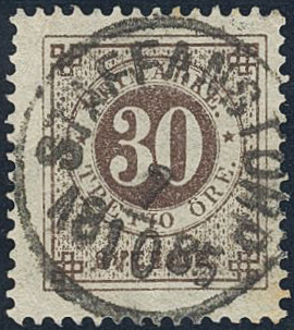 Sweden. Facit 35i used, 30 öre brown on calendered paper. Superb cancellation STAFFANSTORP 7.10.1885.