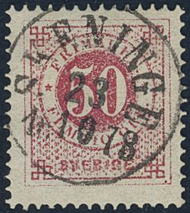 Sweden. Facit 36a used, 50 öre carmine. Superb–EXCELLENT cancellation SKENINGE 23.10.1878.