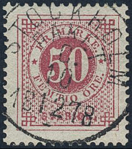 Sweden. Facit 36b used, 50 öre carmine-rose. EXCELLENT cancellation STOCKHOLM PAKET C 10.12.1878.