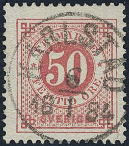 Sweden. Facit 36g used, 50 öre carmine-red on soft paper. EXCELLENT cancellation KARLSTAD 6.1.1884.
