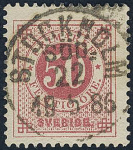 Sweden. Facit 36h used, 50 öre carmine-rose on calendered paper. EXCELLENT cancellation STOCKHOLM SÖD 22.5.1886.