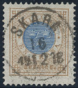 Sweden. Facit 38a used, 1 Krona orange-brown/blue. EXCELLENT cancellation SKARA 16.12.1878.