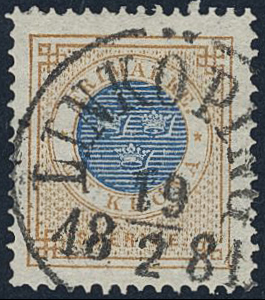 Sweden. Facit 38b used, 1 Krona yellow-brown/dark blue. Superb cancellation LINKÖPING 19.2.1881. Scarce shade.
