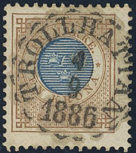 Sweden. Facit 38g used, 1 Krona yellow-brown/blue on calendered paper. EXCELLENT cancellation TROLHÄTTAN 4.9.1886.