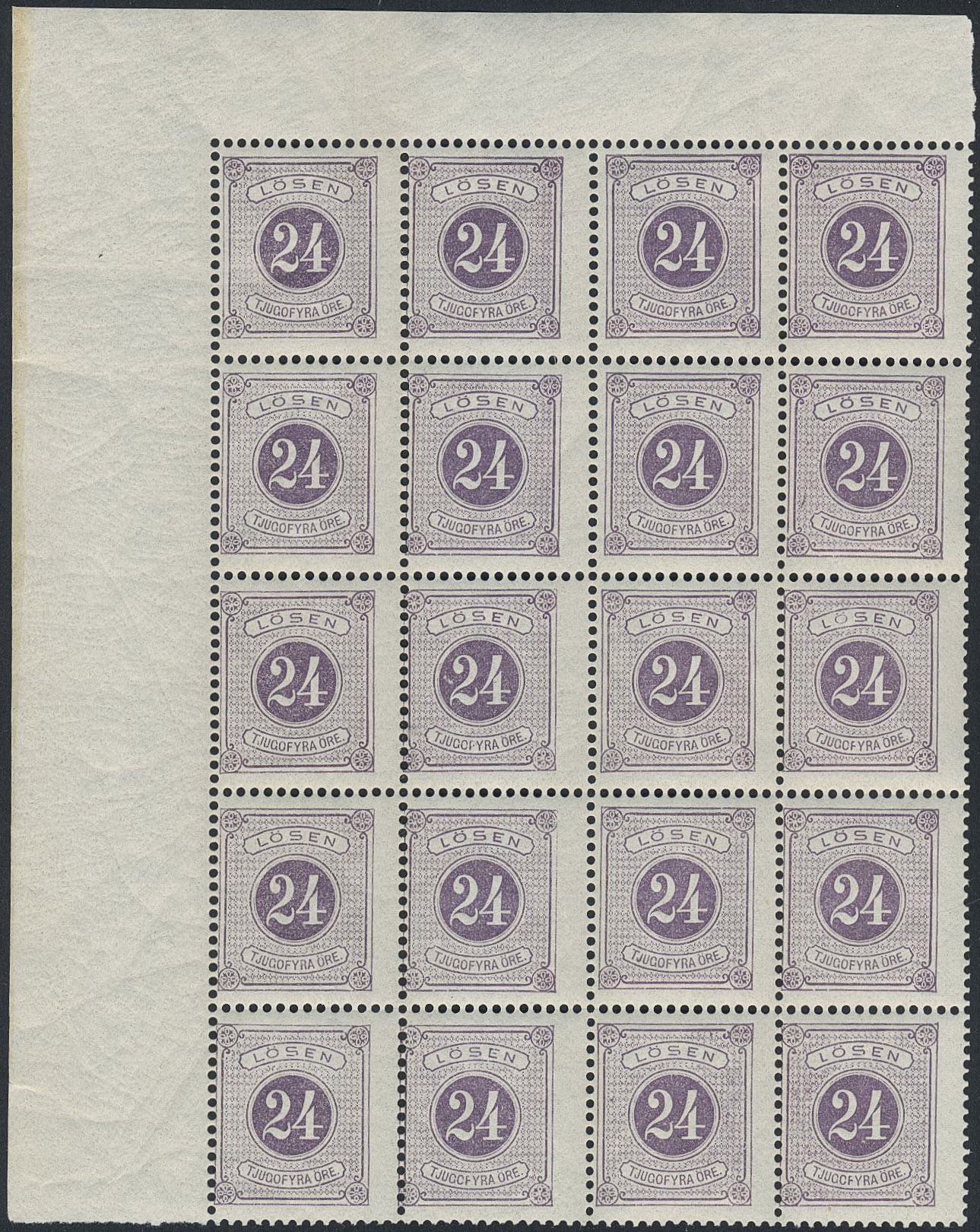 Sweden. Postage due Facit L17 ★★, 24 öre lilac, perf 13. Upper left section of a sheet (20 stamps) with margins both on the top and to the left.
