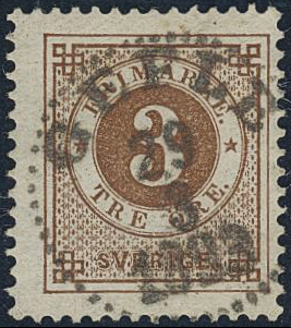 Sweden. Facit 41c used, 3 öre dark orange-brown. Superb cancellation GEFLE 29.3.1893. One slightly short perf.